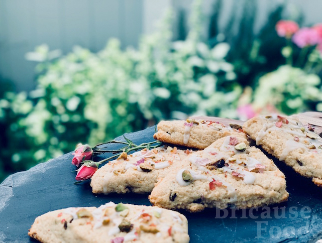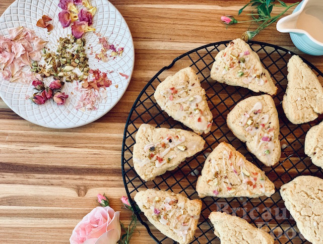 Light, delicate scones with floral and aromatic notes, punctuated by crunchy pistachios, and drizzled with rose water glaze.